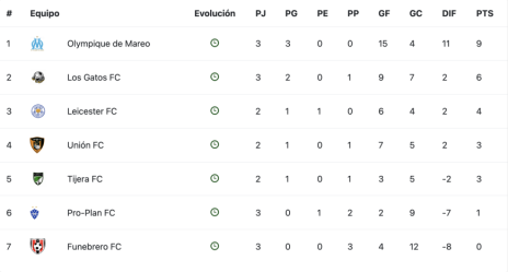 Con tres triunfos en tres presentaciones, Olympique de Mareo es el único puntero y se afianza como candidato al título. Sin embargo, Los Gatos mantienen un rendimiento sólido y Leicester se mete en la pelea con una victoria clave.
